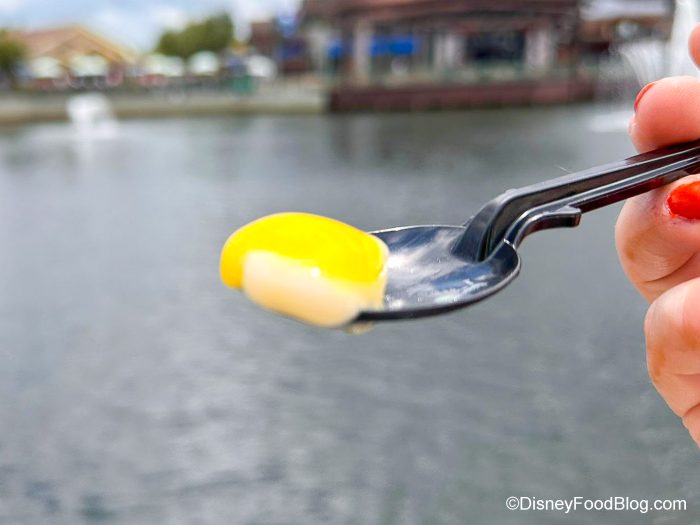 So first, the DOLE Whip with vanilla soft-serve and pineapple wedge is a nice break from the other two flavors. It’s just a standard Dole Whip, but the other two treats are SO sweet that the tartness of this is a nice way to break up that.