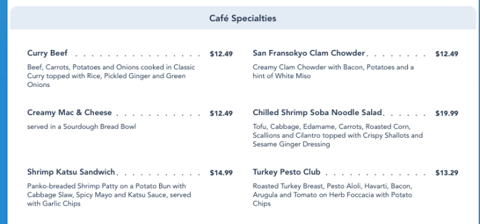 In terms of cafe specialties, there is Curry Beef, Mac and Cheese served in a Sourdough Bread Bowl, Clam Chowder, a Soba Noodle Salad, and some sandwiches.