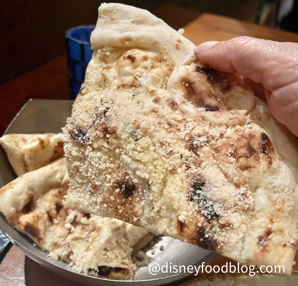 What would a meal be without bread service? Trust me — you will want some bread to soak up the sauce with your meal. Choices here include roti (grilled flatbread), papadum (Indian crackers), chili cheese kulcha (a stuffed roll), and naan. At my server’s recommendation, I opted for the garlic parmesan naan ($6). I did take note of another interesting choice — the Short Rib French Onion Naan ($12), which was described to me as a “naan quesadilla” stuffed with beef short rib, with an au jus-style dipping sauce. This sounded DELICIOUS to me, but I only have one stomach, and knew I had already ordered way too much food!