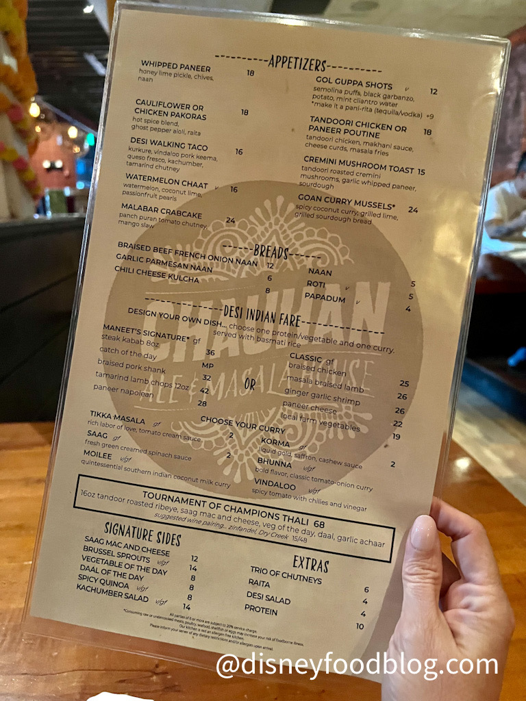 The menu includes an extensive appetizer selection, breads, the restaurant’s “design your own dish” entree selections, sides, and the resturant’s Tournament of Champions Thali — a “large plate” meal that includes a tandoor roasted ribeye, saag mac and cheese, the vegetable of the day, daal (lentil stew), and garlic achaar (a pickled condiment).