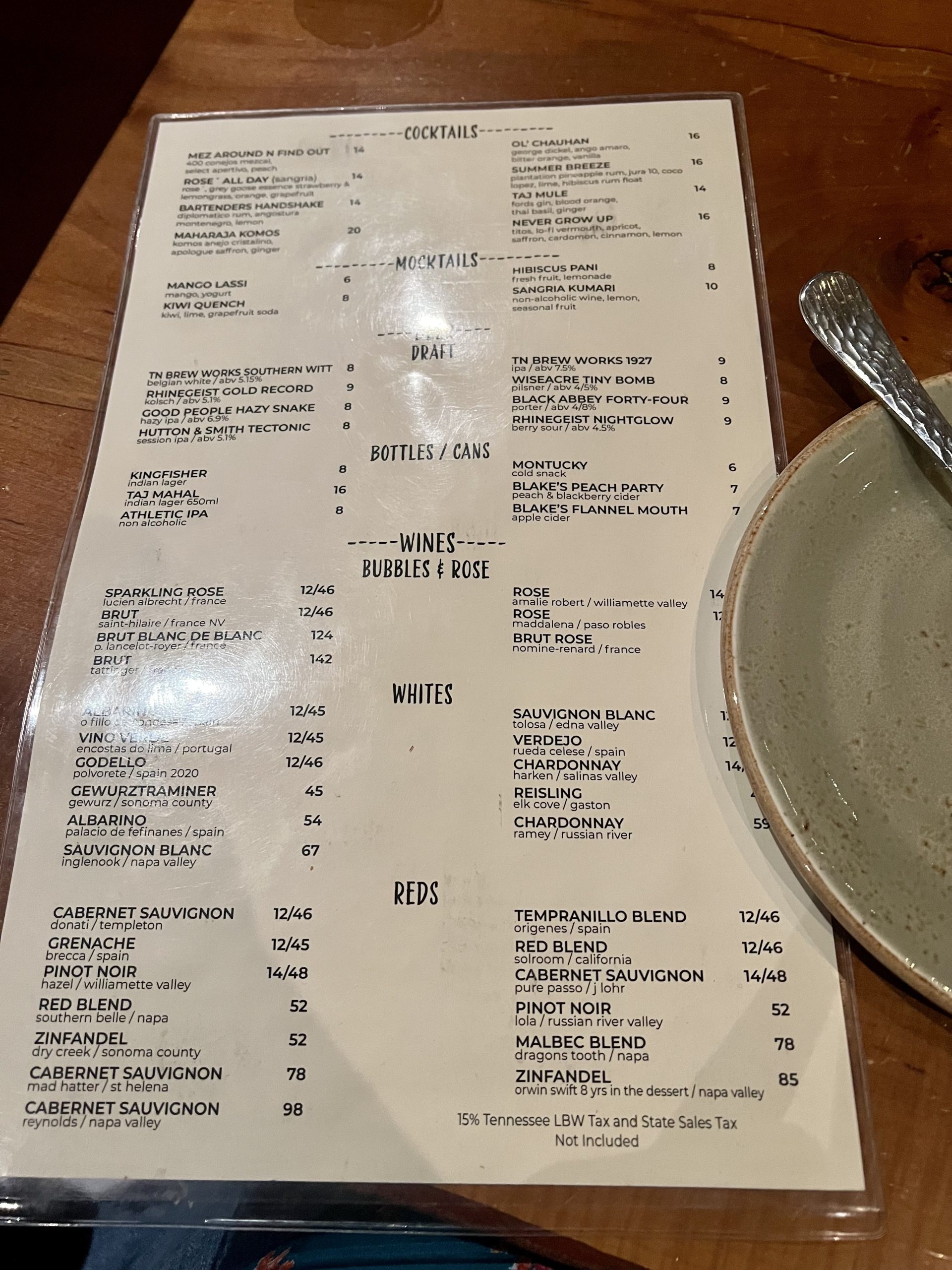 The back side of the menu includes specialty cocktails, mocktails, draft and bottled beers, and wines.