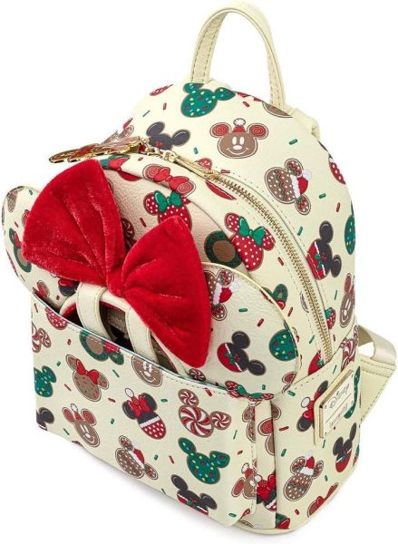 Need a new backpack for a quick trip to the parks? Check out this Loungefly mini backpack that features a Mickey and Minnie Christmas cookie pattern and matching Minnie ears.