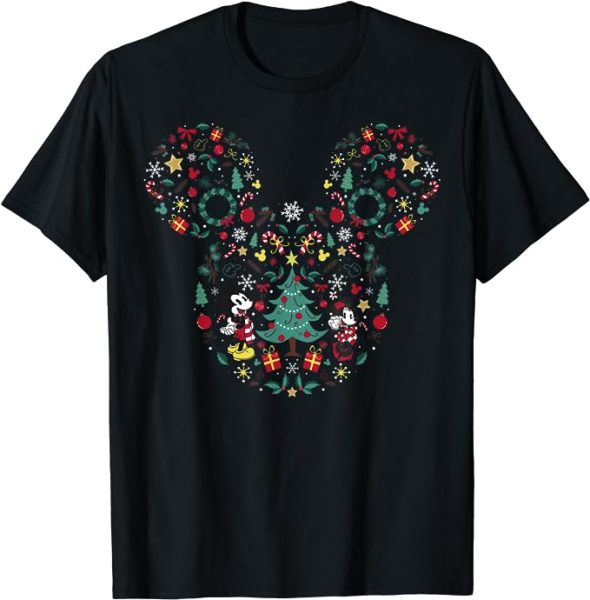 Need a new tee for that quick trip to the parks? It features a Mickey and Minnie Christmas tree pattern.