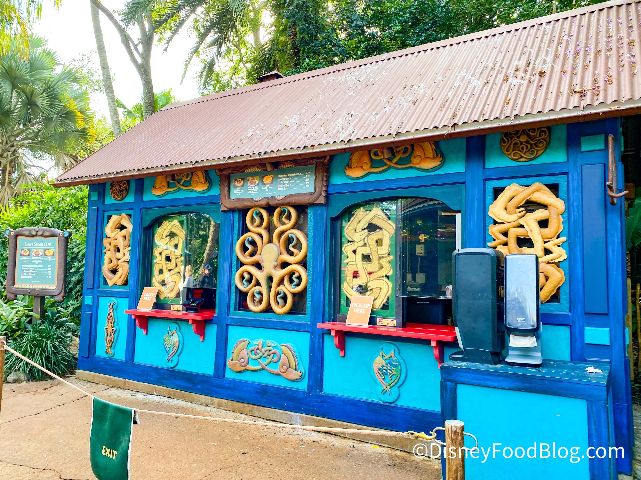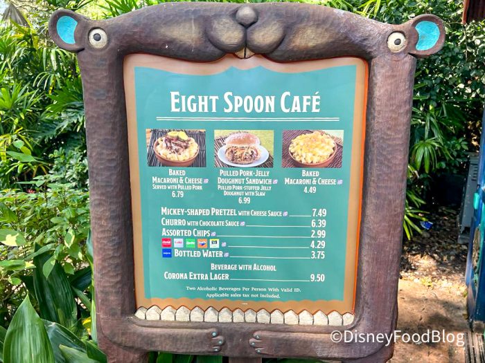 Eight Spoon Cafe is located in Discovery Island at Disney’s Animal Kingdom. Here, you can choose from a variety of snacks and small plates as well as fountain beverages. While the small menu typically causes guests to walk right on past, let us assure you that this menu is small but mighty. BUT let’s not get ahead of ourselves, alright? First, let’s talk about the atmosphere at Eight Spoon Cafe.