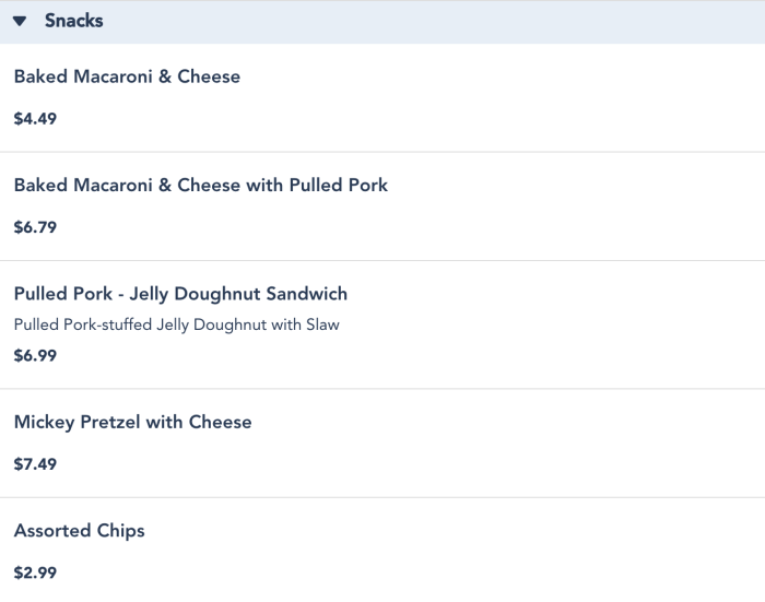 If you like jelly, donuts, and pulled pork, then this is the snack for you. It’s also really easy to eat while walking around the park. If you’re not a fan of sweeter foods and don’t want the jelly mixing with your pork, you might want to skip this one, because there’s no way around all that jelly!