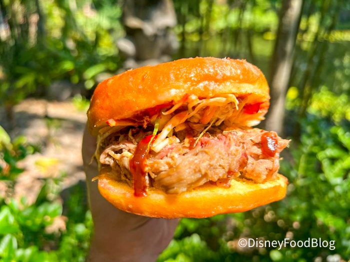 Our first impression was that this sandwich is relatively small — which makes it a great snack. The doughnut was soft and sweet, and it paired REALLY well with the savory flavor of the pulled pork. The slaw was underneath the pork while the jelly topped it all off underneath the top layer of doughnut. While the last time we visited, the Cast Members told us the jelly was grape flavor, we got more of a cherry flavor this go around. We remember not getting a whole lot of the grape flavor last time, either.