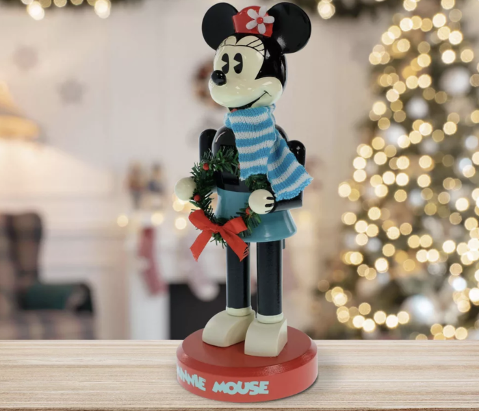 Make sure you pick up the Minnie version for a matching set! Minnie wears the same blue and white scarf and is carrying a decorated wreath.