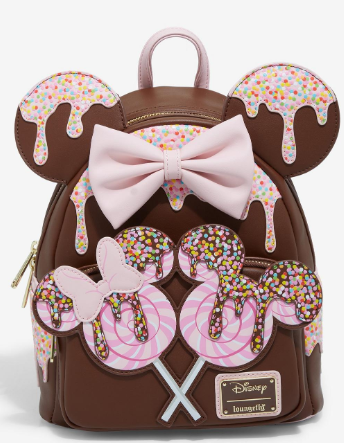 The newest Loungefly backpack comes beautifully themed with chocolate lollipop treats on the front and iced Minnie ears on top!