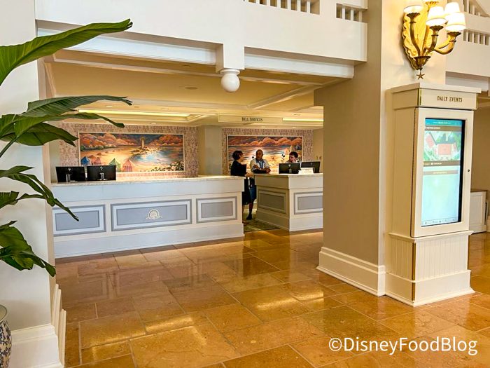 Recently, we had seen some construction going on in the lobby of the resort. While the construction was going on, there were walls up in front of the front desks, with Cast Members temporarily positioned in front of those walls to check guests in.