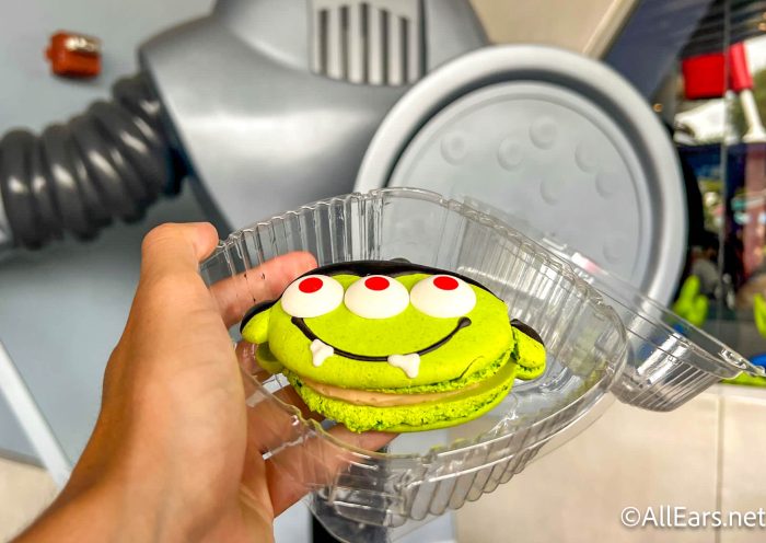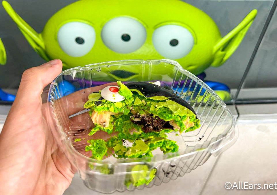 For our last treat, we’re making a stop at Alien Pizza Planet to grab the Vampire Alien Macaron for $7.99. It’s a green alien macaron filled with salted caramel buttercream, chocolate ganache, and brownie bits.