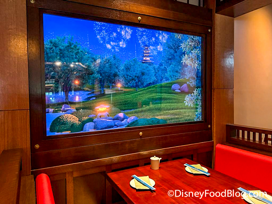 This was a way that the restaurant could elevate the experience for guests who did not get a fireworks view from their table, but it’s on display all day! While we love this thoughtful addition to the dining room, it’s even more intentional than you might think at first glance. Like many other decor elements around the dining room, the digital widows heavily focus on the seasons.