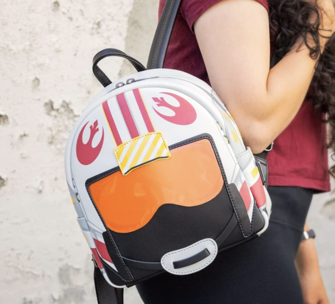 The backpack looks like the helmets that the fighter pilots wore in the movie, and there’s a picture of an X-Wing and the Death Star on the back.