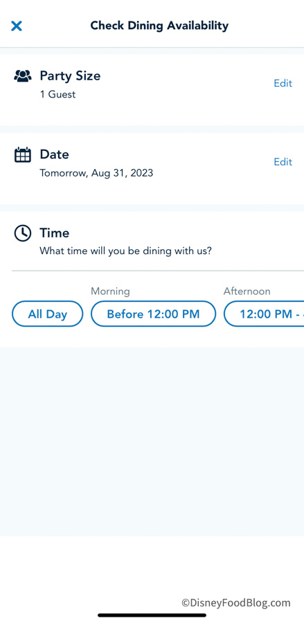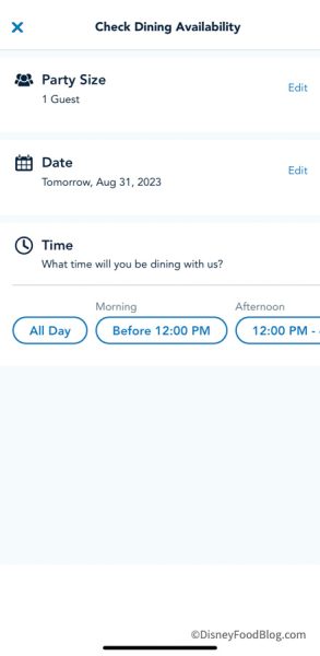 Updated versions of the Disney World app now feature the NEW and IMPROVED dining reservations system and it’s about to make your life a whole lot easier. When you check dining availability now, you can actually opt to see ANY reservation available for that entire day or search by times (morning — before 12PM, afternoon — 12PM-4PM, or evening — after 4PM).