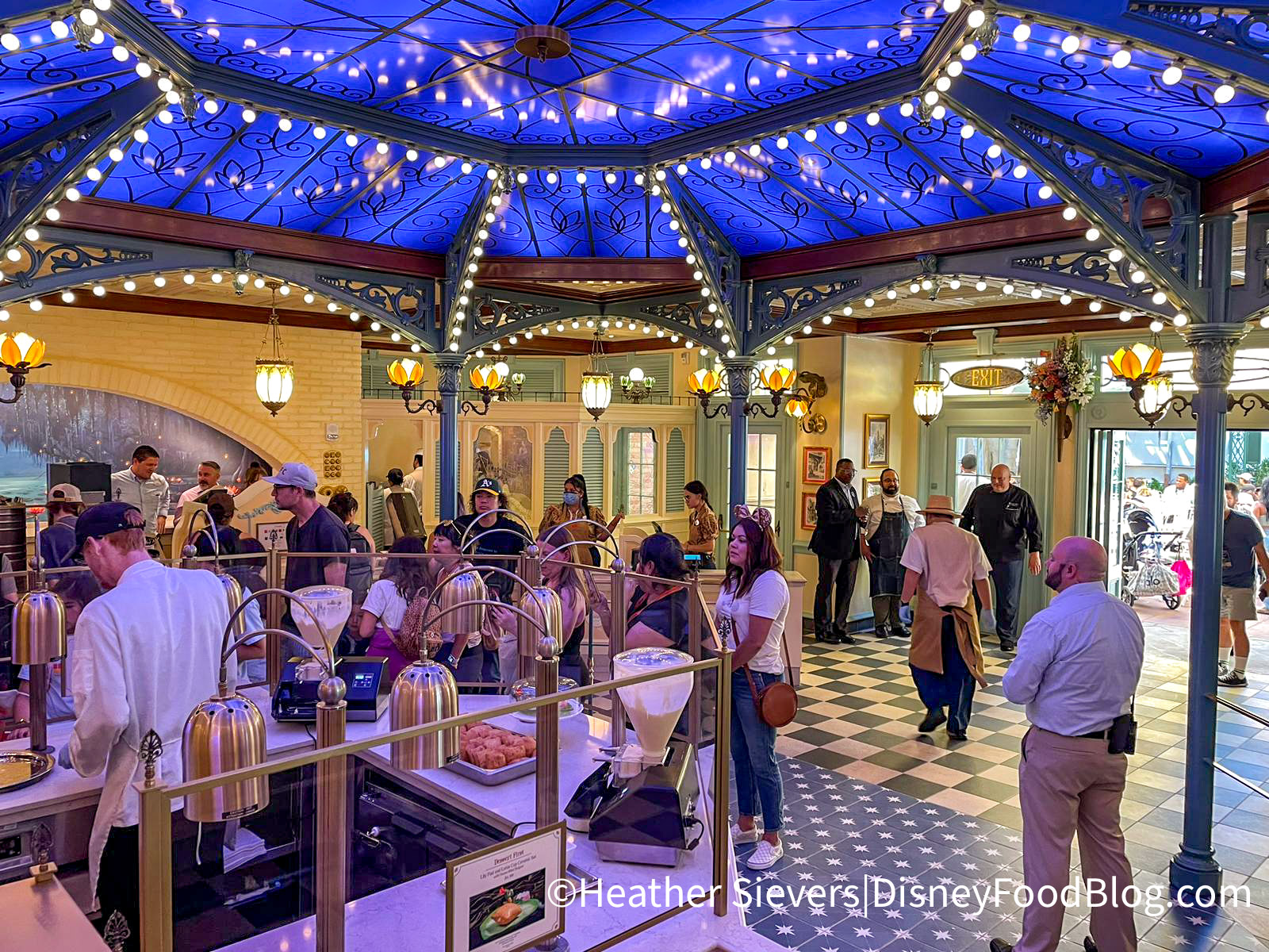 But, you will find a whole lot more pizzazz inside Tiana’s Palace. The ceiling has been transformed to look like the night sky through an ornate skylight with blue light shining through. More of those bistro lights have been added inside as well, creating the vibe that you’re smack dab in the middle of New Orleans.