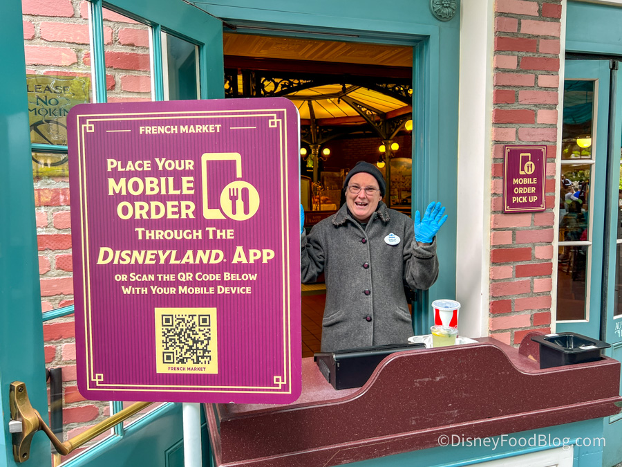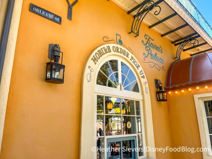 …but now there is a dedicated Mobile Order Pickup Window. You can also see how Disney has transformed the exterior from a brick facade to an orange stucco reminiscent of those in the French Quarter.