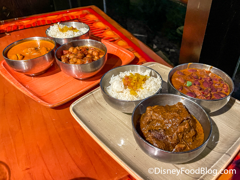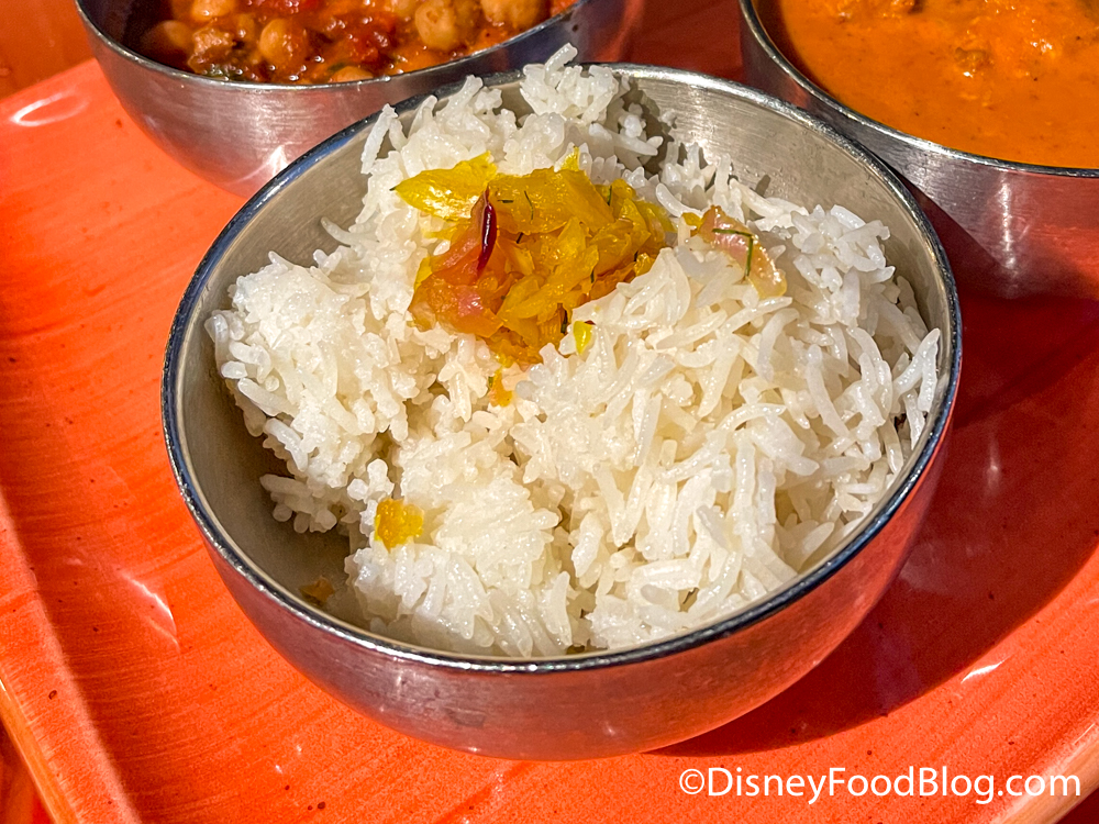 The Accompaniments are placed in order from spiciest to most mild, starting with the Red Chili Samba. This one is extremely spicy — not like Disney spicy — so be careful! The Spicy Jalapeño-Lime Pickle was really nice and not nearly as spicy. While it did have some heat, the pickle flavors cut it a bit. We really enjoyed the Mango Chutney — it was mild and almost pesto-like. Overall there was a great variety here and we really enjoyed it!