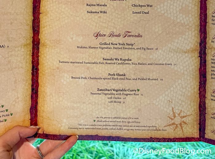 Otherwise, you could choose a Spice Route Favorite, like the Grilled New York Strip or the Samaki Wa Kapaka.