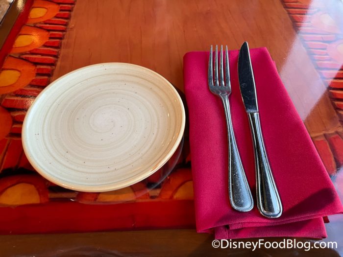 Our table setting included an appetizer plate, cloth napkin, and silverware.