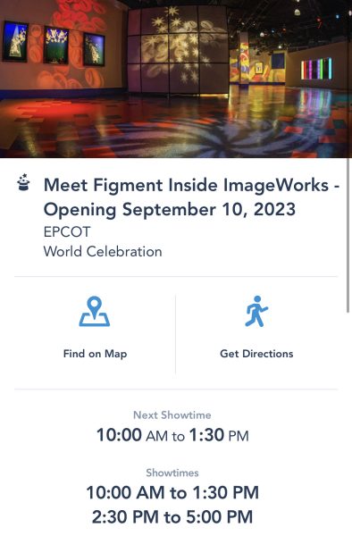 If you’re looking to meet Figment during your vacation, check your My Disney Experience App for the times he’s greeting, and be sure to factor in a decent amount of time for the line. Today, our app shows he’s greeting guests from 10AM to 1:30PM, and then again from 2:30PM to 5PM.