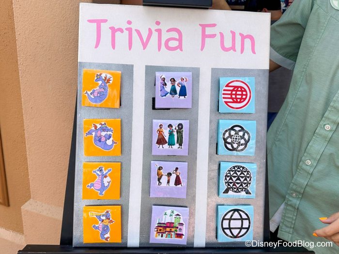 Look for the festival market next to the booth — there, you might find a trivia game! (Note that it may not always be out — we spotted it during our recent trip to this park.) You get to choose what category of trivia you want to play: EPCOT, Encanto, or Figment. Pick your category and answer four questions correctly, and you get a prize!