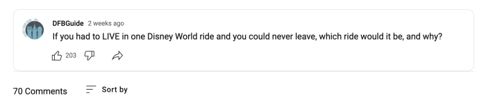 We reached out to our followers on YouTube to ask: “If you had to LIVE in one Disney World ride and you could never leave, which ride would it be, and why?” The results were pretty varied. We had quite a few people leave their opinions in the comments. We recently made a video full of Disney World ride tips, and you can watch it right here!