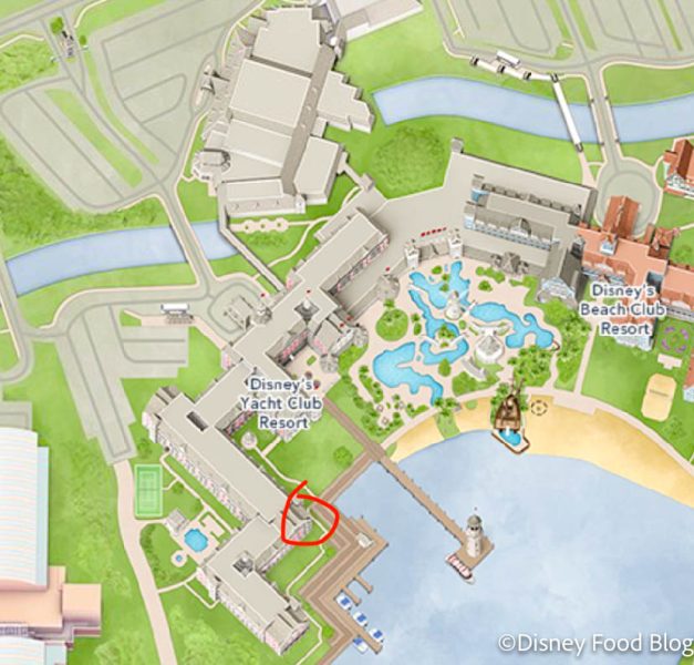 The secret door is located at Disney’s Beach Club Resort, super close to the International Gateway entrance to EPCOT (the back entrance, by the France and UK pavilions).