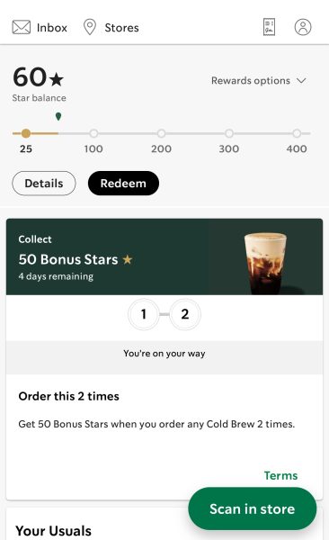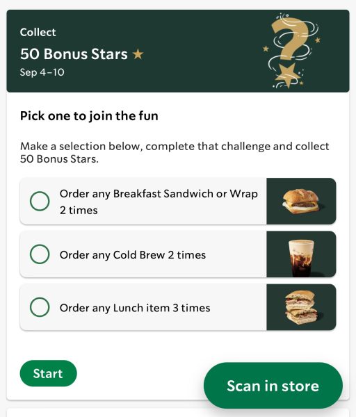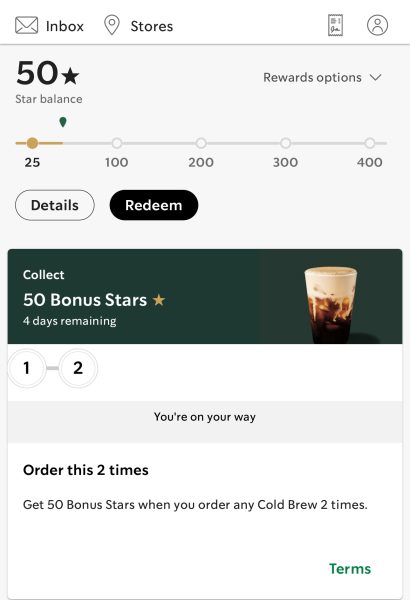 Oftentimes, however, Starbucks will run a challenge where you can earn even more Bonus Stars. For example, here the app gives me a way to earn an additional 50 Stars (on top of the base Stars that I earn for every dollar I spend) by making specific purchases within a certain time frame. At a typical Starbucks, you would “Start” a challenge, and every time you made a qualifying purchase, the app would track it and give you credit toward the challenge.