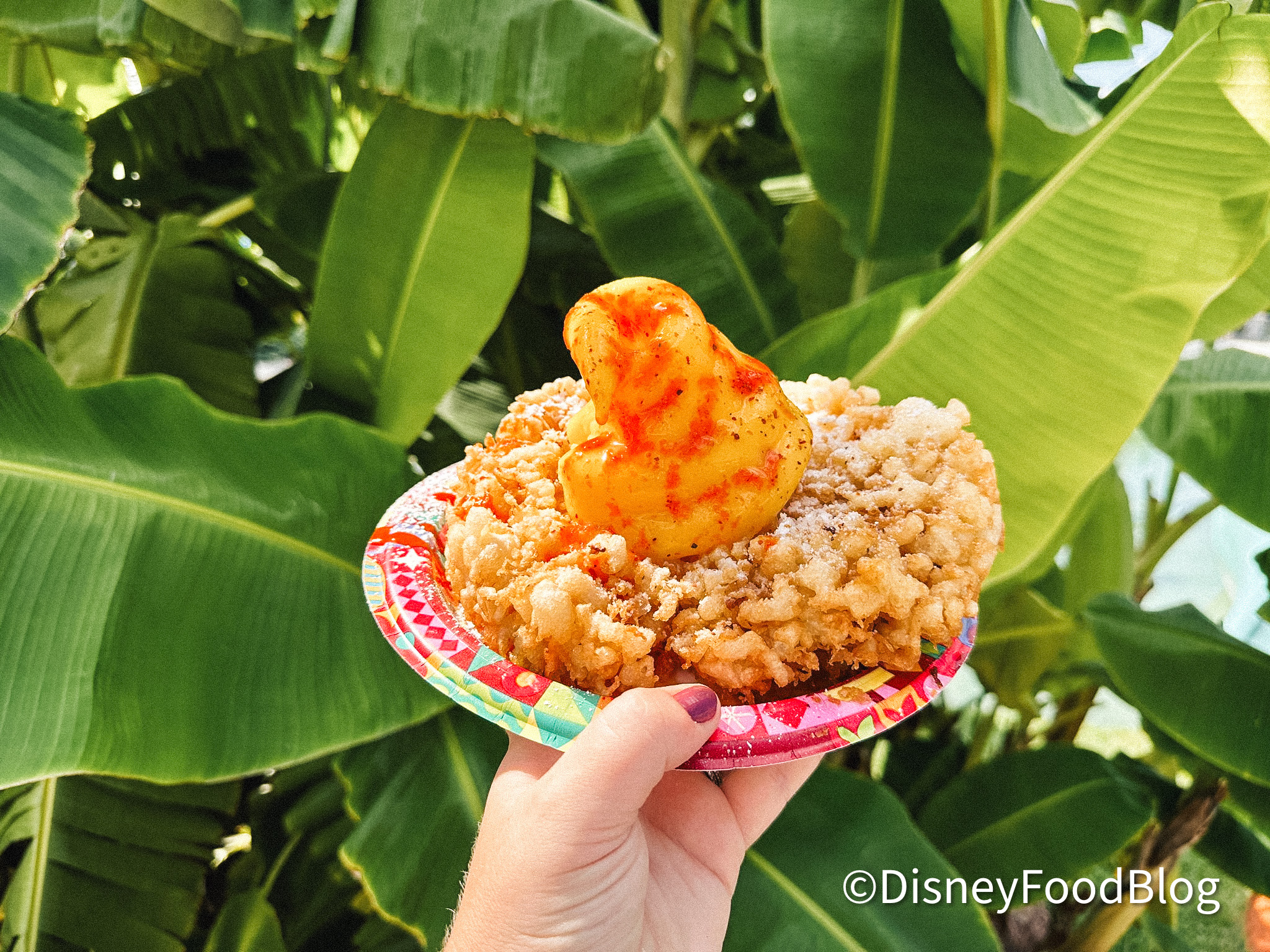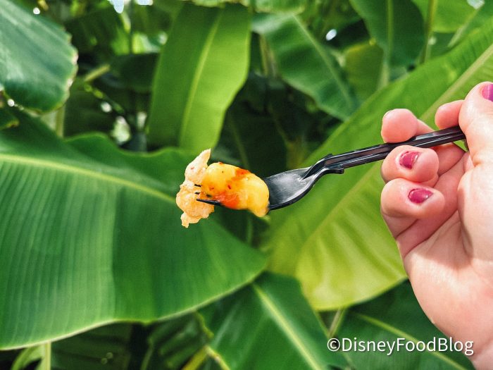 The ONLY complaint we have about this is that we wish there was more of the puree slathered onto the funnel cake. It really enhances the flavor of each aspect of the dish, as well as provides a bit more of that refreshing mango flavor we like. Come on, Disney. Don’t be stingy with the puree!