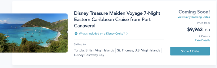 You can start booking your cruise aboard the Disney Treasure on September 20th, 2023. YES, you can begin booking that soon! That’s in just a few short days, so set your alarm, grab your credit card, and be prepared — because these cruise slots will go FAST.
