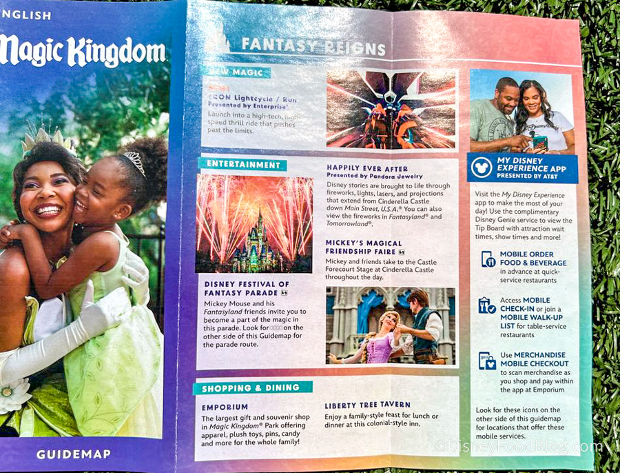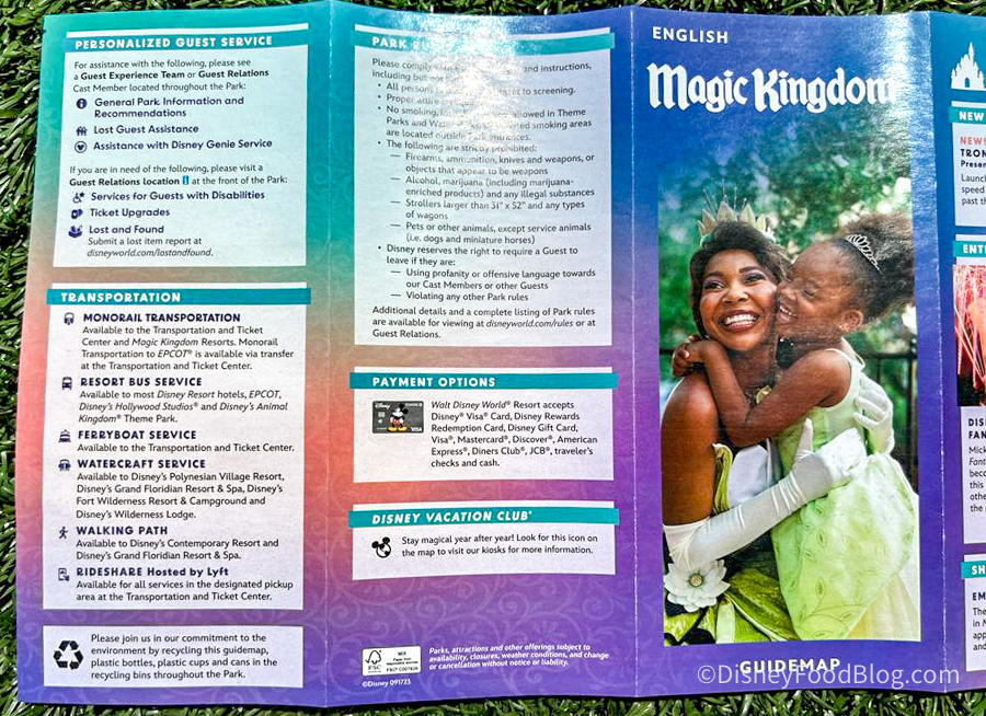Magic Kingdom officially has a new park map! We found it in the park and also over in Disney Springs. The front features Princess Tiana hugging a child in a Princess Tiana costume and tiara as well.