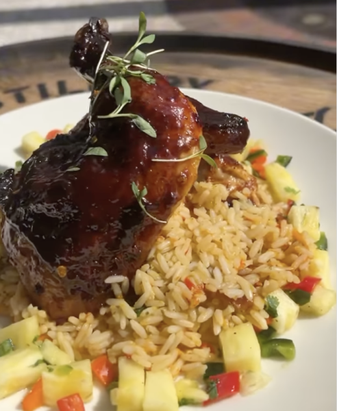This offering is “infused with chipotle pepper and achiote marinade, glazed with guajillo chili, topped with pineapple pico de Gallo, and served on a bed of flavorful sofrito rice.” It sounds like it’s packed with flavor!