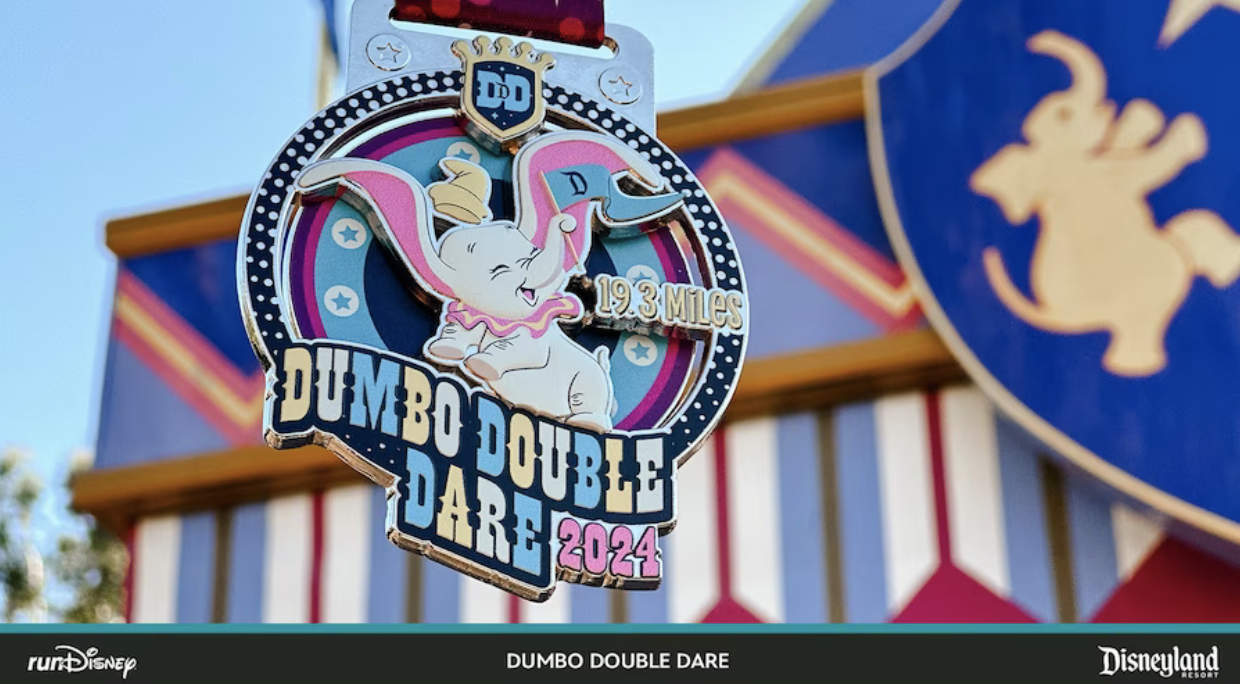 Last but not least is the challenge medal, which is our FAVORITE of them all. The Dumbo Double Dare Challenge Medal is available to those who maintain a 16-minute mile and finish both the 10K and Half Marathon. The medal features a very adorable Dumbo waving a Disneyland pennant. The colors, the circus font, the image of Dumbo — it’s all too much. We cannot handle how cute this medal is.