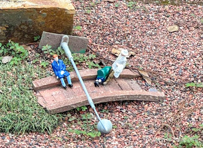 And these bridge dwellers seem to have suffered a similar fate. This lamp post has accidentally fallen over — or was it pushed? Maybe someone tampered with the integrity of the footings, causing it to fall over at just the right time. Our friends over on the right appear to be pretty cozy, perhaps we’ve uncovered a torrid love affair and a scorned ex has decided to get his revenge!