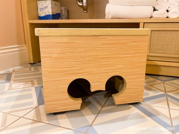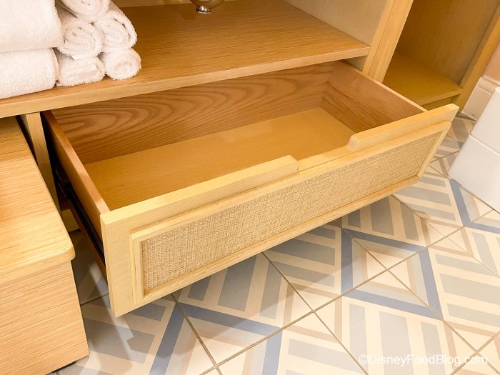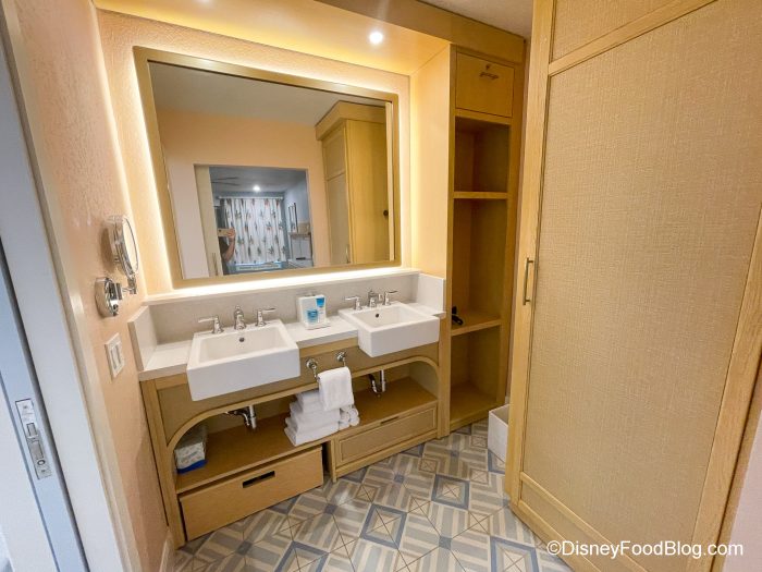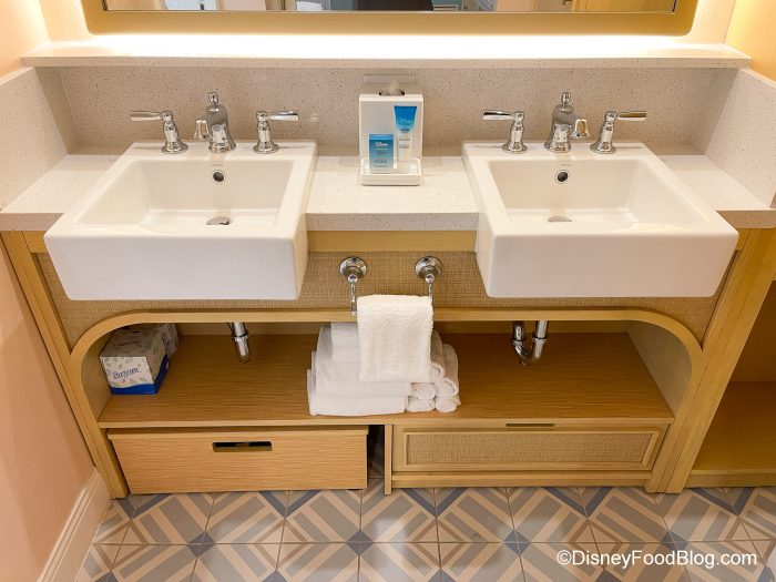 To the right of the sinks are some shelves — these rooms have a lot of great spaces for organization and storage.