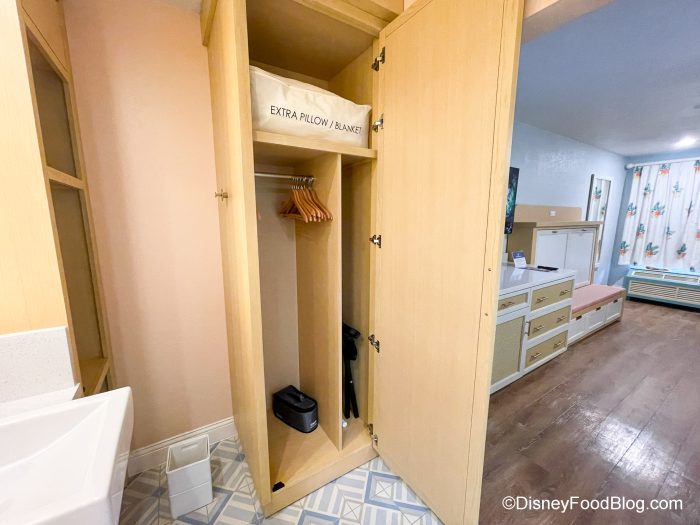 An extra pillow and blanket are on the top shelf. There are plenty of hangers for those items you wish to hang up during your stay.