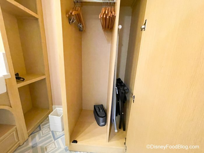 An iron is in the bottom of the closet, and there’s a space to the left of that with an ironing board.