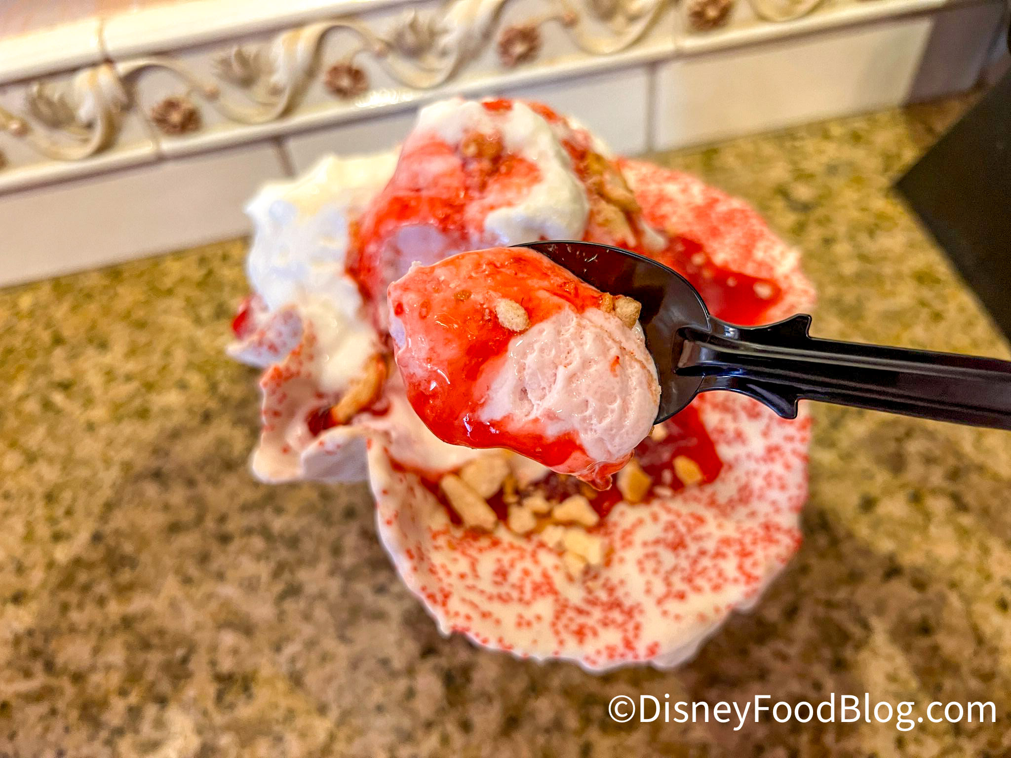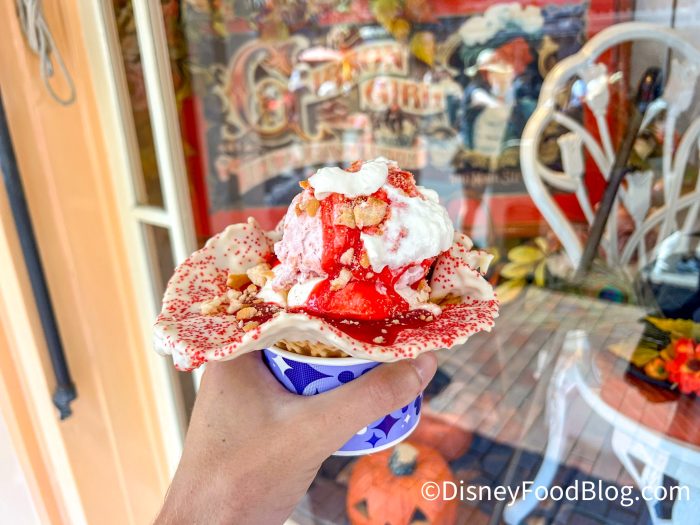 We’re DisneyFoodBlog, so we try alllll the new offerings and tell you all about them to help you decide what is and isn’t worth the money. We headed over to Gibson Girl Ice Cream Parlor to try their new sundae. Spoiler alert: it was an explosion of strawberries!