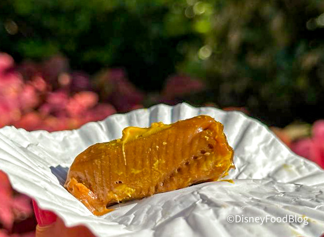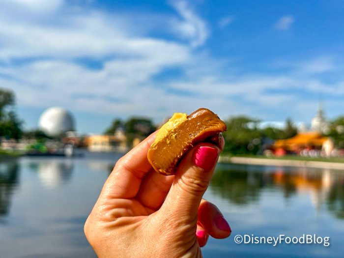 It’s a perfect fall day at Disney World. The sun is shining, the skies are a clear, deep blue, and it’s one of those rare occasions that it actually feels like fall in Central Florida. It’s the type of weather that allows you to wear shorts and a long-sleeve shirt and feel comfortable as you trek around the park. You’re at EPCOT, and although hints of summer linger, you can spot trees throughout the park whose leaves are just beginning to turn brilliant shades of orange, yellow, and red. You’re craving a snack that just FEELS like fall. We know just where to head.