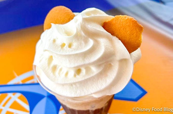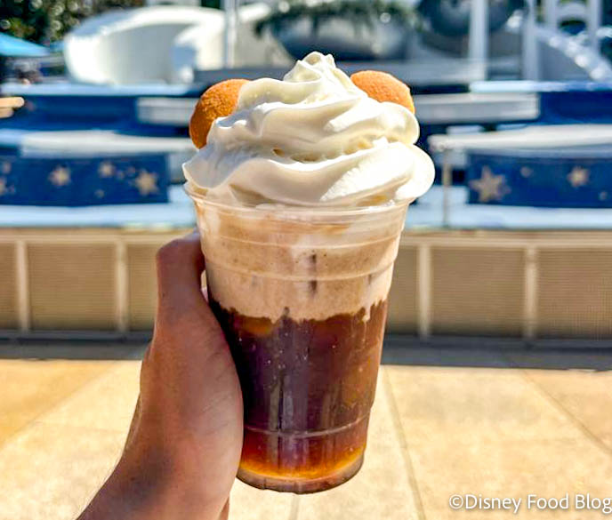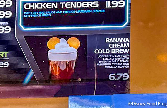 The banana-infused cold brew is sold for $6.79 at Galactic Grill in Disneyland’s Tomorrowland. It is made with Joffrey’s Coffee cold brew and banana milk foam, and topped with whipped cream and some vanilla wafers.
