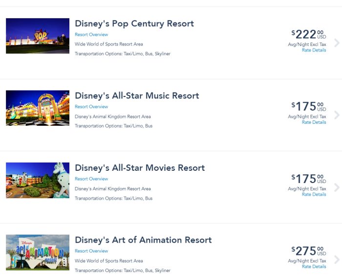The same room at Art of Animation for the same dates is $275 per night! The All-Star Resorts are $175 per night. Now, it’s understandable that Pop Century and Art of Animation cost more due to their Skyliner access, but why is Art of Animation more expensive? They offer the same access to the Skyliner. They both have great theming. Their standard rooms are similar in size. The food courts offer almost exactly the same menus.