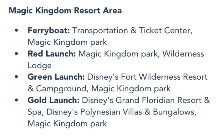 At Magic Kingdom, you’ll need to take the Red Launch to get to Wilderness Lodge or the Green Launch if you’re heading toward Fort Wilderness.