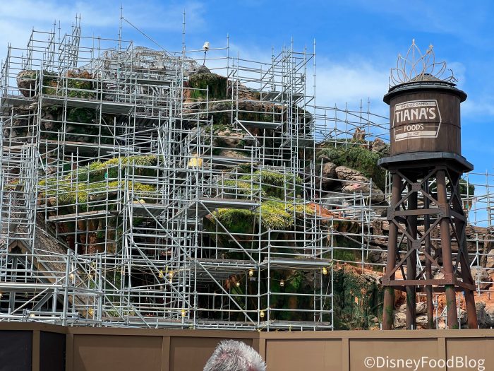 The new ride will reopen sometime in late 2024. We’ll be watching for more updates on the reopening timeline. The tree at the top of this ride has been removed as Disney continues construction, and several new rock structures have been built at the bottom of the drop. There’s a new water tower as well, which says “Tiana’s Foods” on the front and “Never, ever lose sight of what’s really important” on the back. It’s topped with Tiana’s crown, which has two stars on it to represent Ray and Evangeline.
