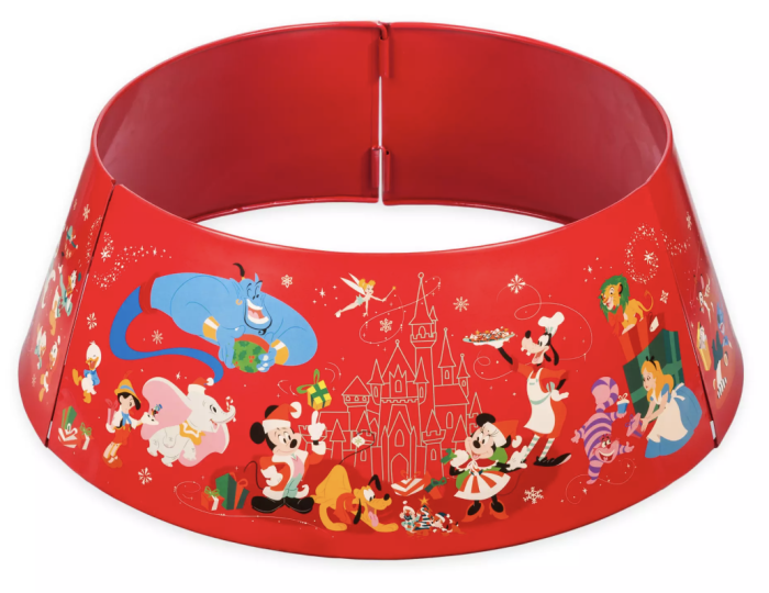 On this Disney Holiday Tree Collar, decal artwork includes images of Mickey, Minnie, Goofy, Pluto, Chip ‘n Dale, Donald, Daisy, Huey, Dewey, Louie, and more! The three-piece metal collar clips together for a festive look around your tree.