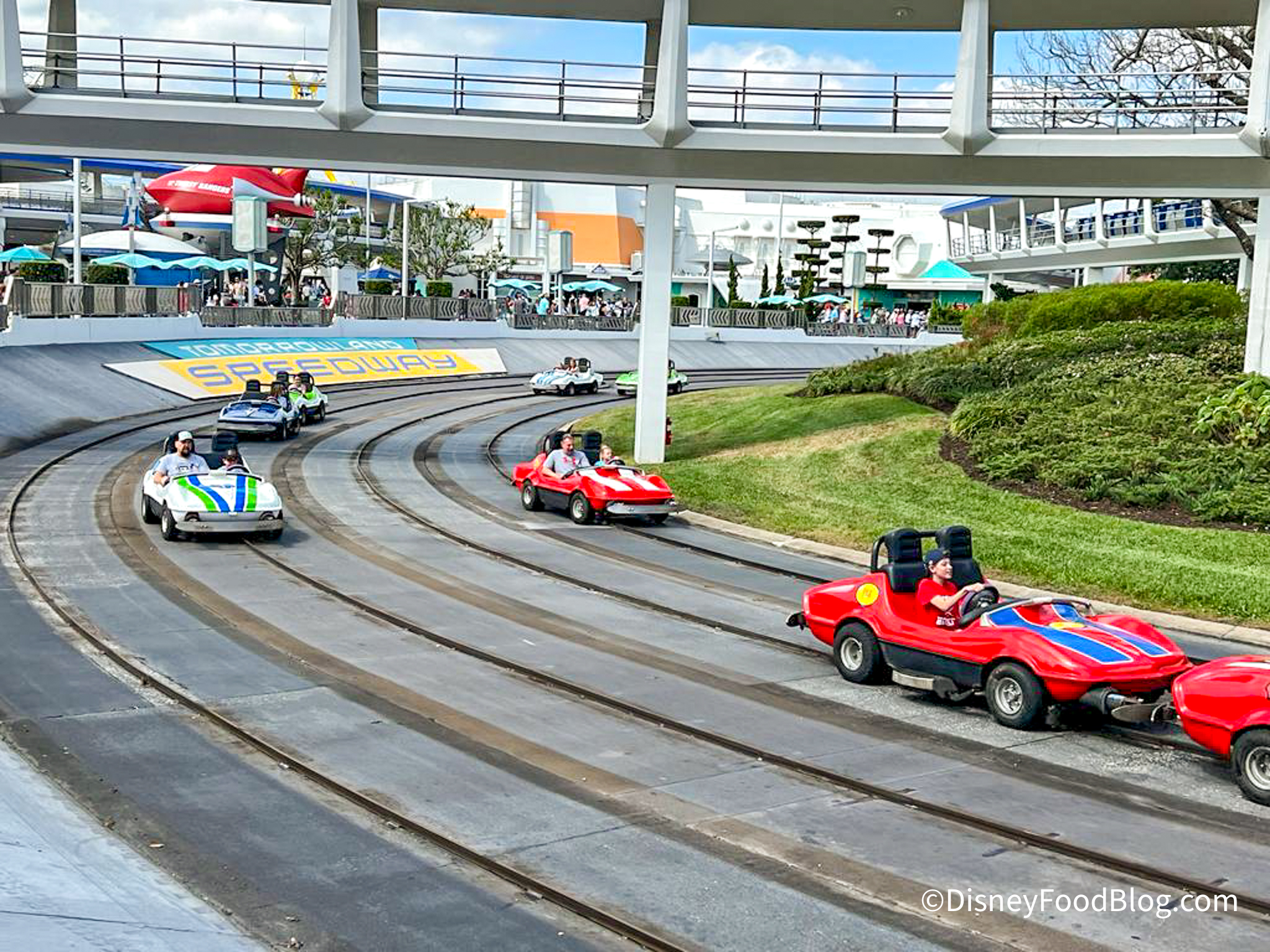 The Speedway is one of the few remaining opening-day attractions (although it’s been renamed since then and had a few changes made). This attraction can seat 1-2 guests per car, and they drive the car on a track around the speedway.