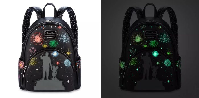 This mini backpack is a great two-in-one bag that serves as a fun daytime AND nighttime accessory! Featuring a gray silhouette of the famous Partners statue, this leather bag has glow-in-the-dark firework screen art and light-up LED fireworks on the front (don’t worry, there’s an On/Off switch). The backpack not only looks flashy but is also fairly functional. It boasts a double zipper main compartment, zip front pocket, side slip pockets, adjustable padded shoulder straps, and a top carry handle. This is a trend you’ll see with the rest of the Loungefly backpacks on this list.