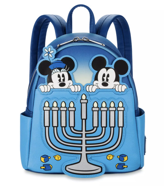 Celebrate the Festival of Lights with this new light-up mini backpack from Loungefly! This Hanukkah-inspired backpack features a die-cut 3D Minnie and Mickey design with a menorah that has actual light-up candles. The backpack is also dreidel-heavy, with dreidel designs on the front as well as a design on the back of Mickey and Minnie playing with a dreidel on the back.