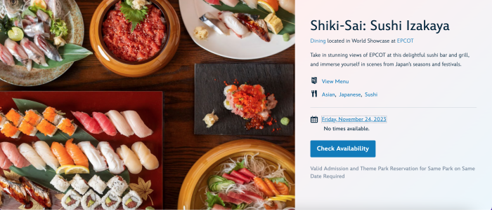 Recently, though, we learned that some people were having a problem picking up available reservations for the restaurant. A quick check of the Disney World website showed no reservations for Shiki-Sai Sushi Izakaya from November 24th through December 2nd, 2023.