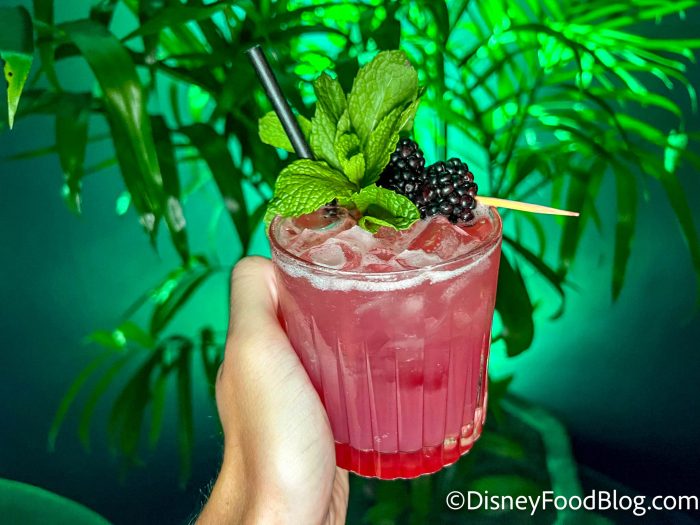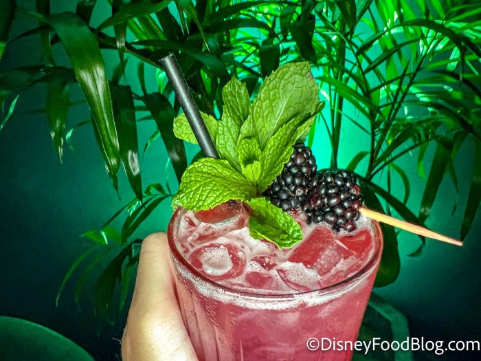 It comes out as this really pretty pinkish-red shade, and it’s topped with mint and blackberries as a garnish. It’s a very fruity drink with a prominent blackberry flavor. The mint is reminiscent of a mojito.