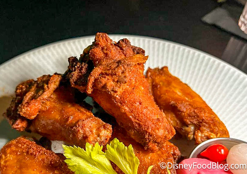 For our eats, we ordered a few different items to try. First up we started with an appetizer, the Chicken Wings. These are $22 and made with a signature dry rub, served with house pickled carrots and celery, alongside Roquefort blue cheese.