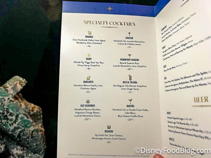 As we mentioned previously, there are plenty of options for those who would like to imbibe, including an array of Specialty Cocktails. They’ve got traditional choices like an Old Fashioned and a Martini, as well as the Bramble, Aviation, Derby, and Hemingway Daiquiri.